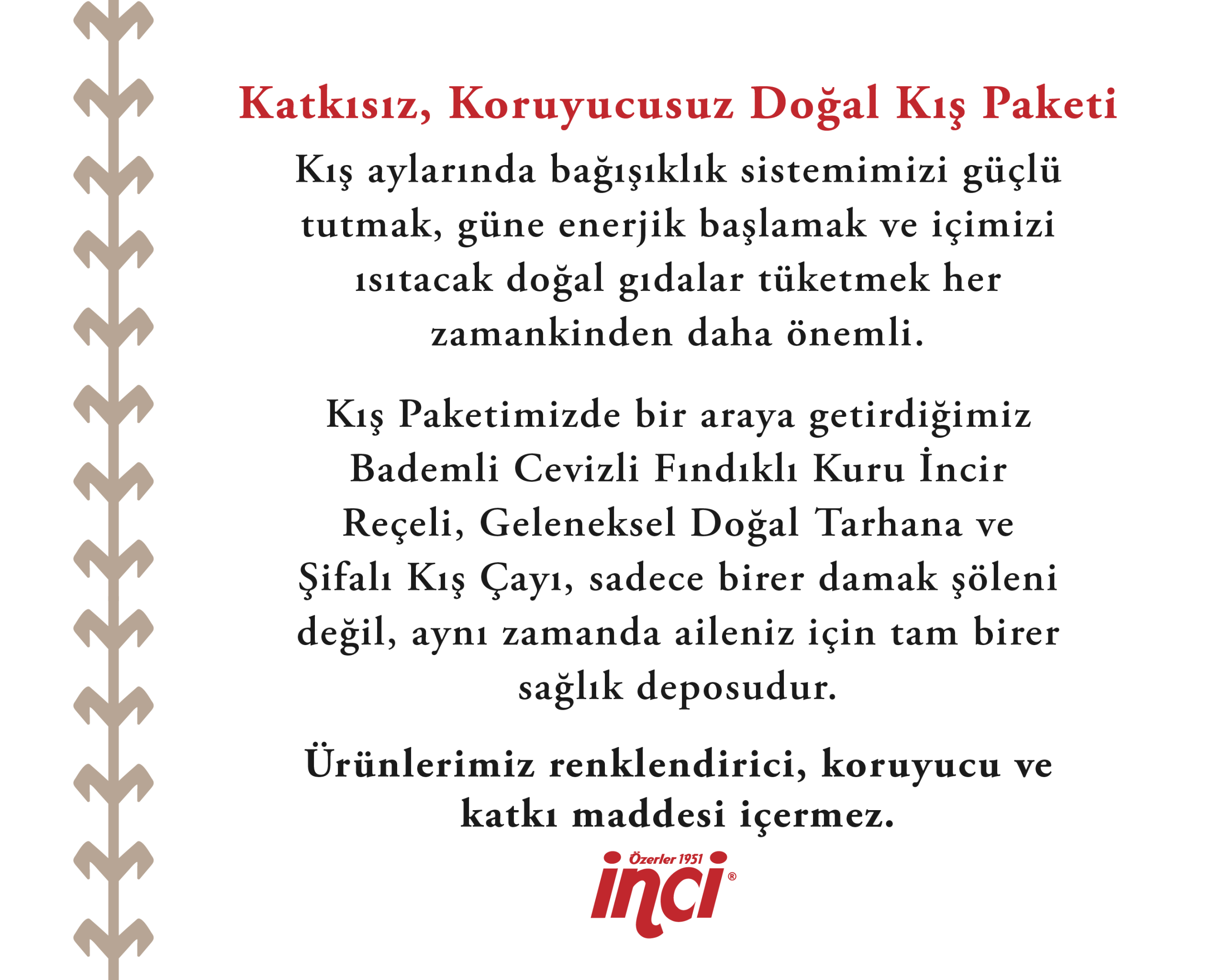 Kış günü içinizi sağlıkla ısıtacak Kış Paketi, hiçbir koruyucu ve katkı maddesi içermeyen doğal içeriğiyle sizlerle.